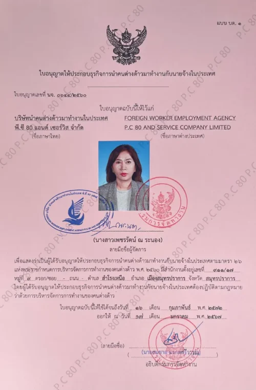 เพราะเราเป็นบริษัทที่ถูกต้องตามกฎหมาย จดทะเบียนกับกรมการจัดหางาน กระทรวงแรงงาน ใบอนุญาตเลขที่ นจ.0044/2560 และวางหลักประกันจำนวน 5 ล้านบาท กับอธิบดีกรมการจัดหางาน กระทรวงแรงงาน กว่า 10 ปี ในการแวดวงธุรกิจด้านการนำเข้าแรงงานต่างด้าว 3 สัญชาติ และงานเอกสารต่างๆ แบบครบวงจร มีความมั่นคง และเชี่ยวชาญ เป็นมืออาชีพในการบริหารจัดการ เพื่อลดภาระและปัญหาให้กับนายจ้าง โดยให้ P.C 80 & SERVICE เป็นผู้ดูแลแทนคุณ มืออาชีพอันดับหนึ่งในการบริการ